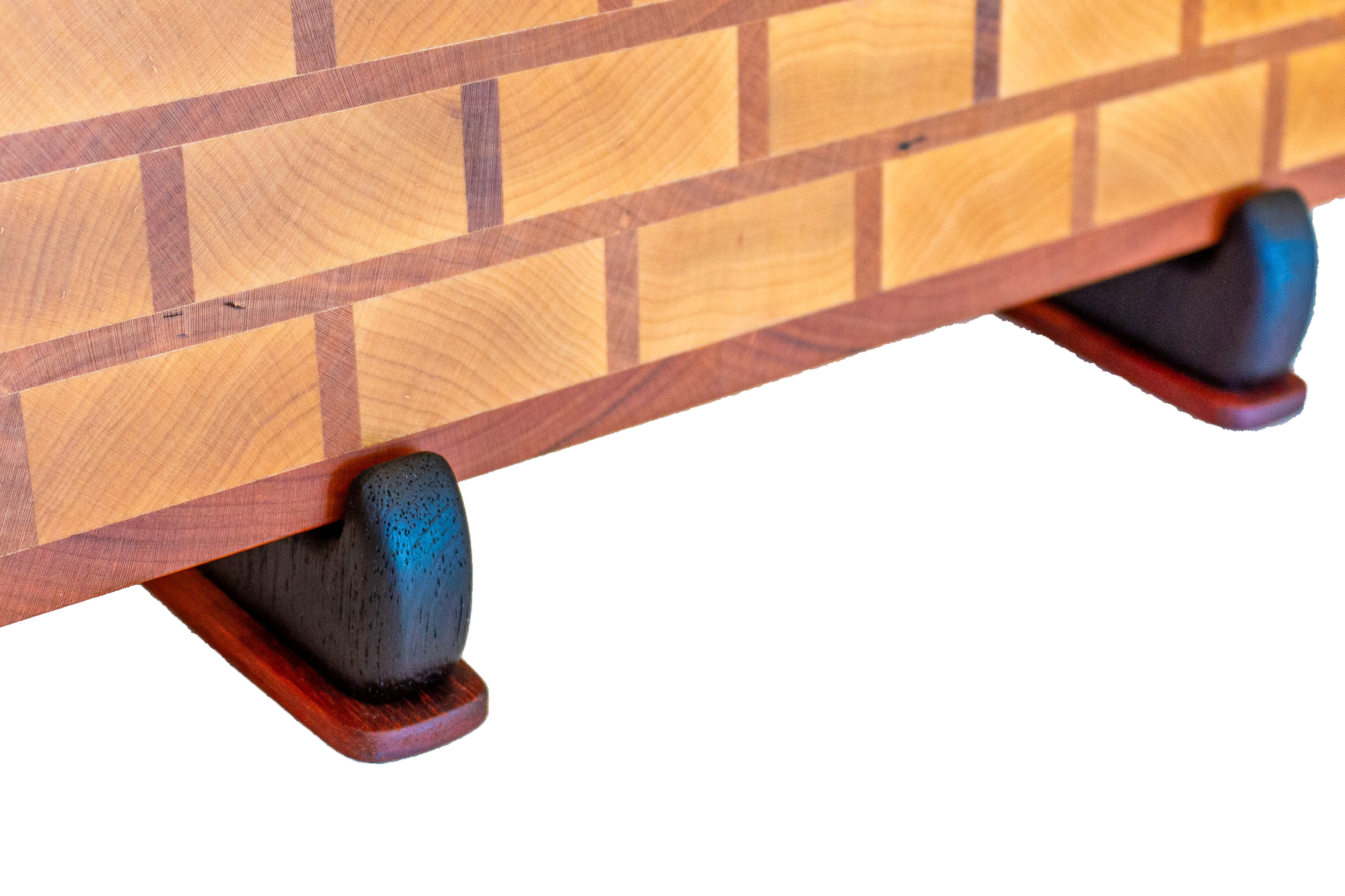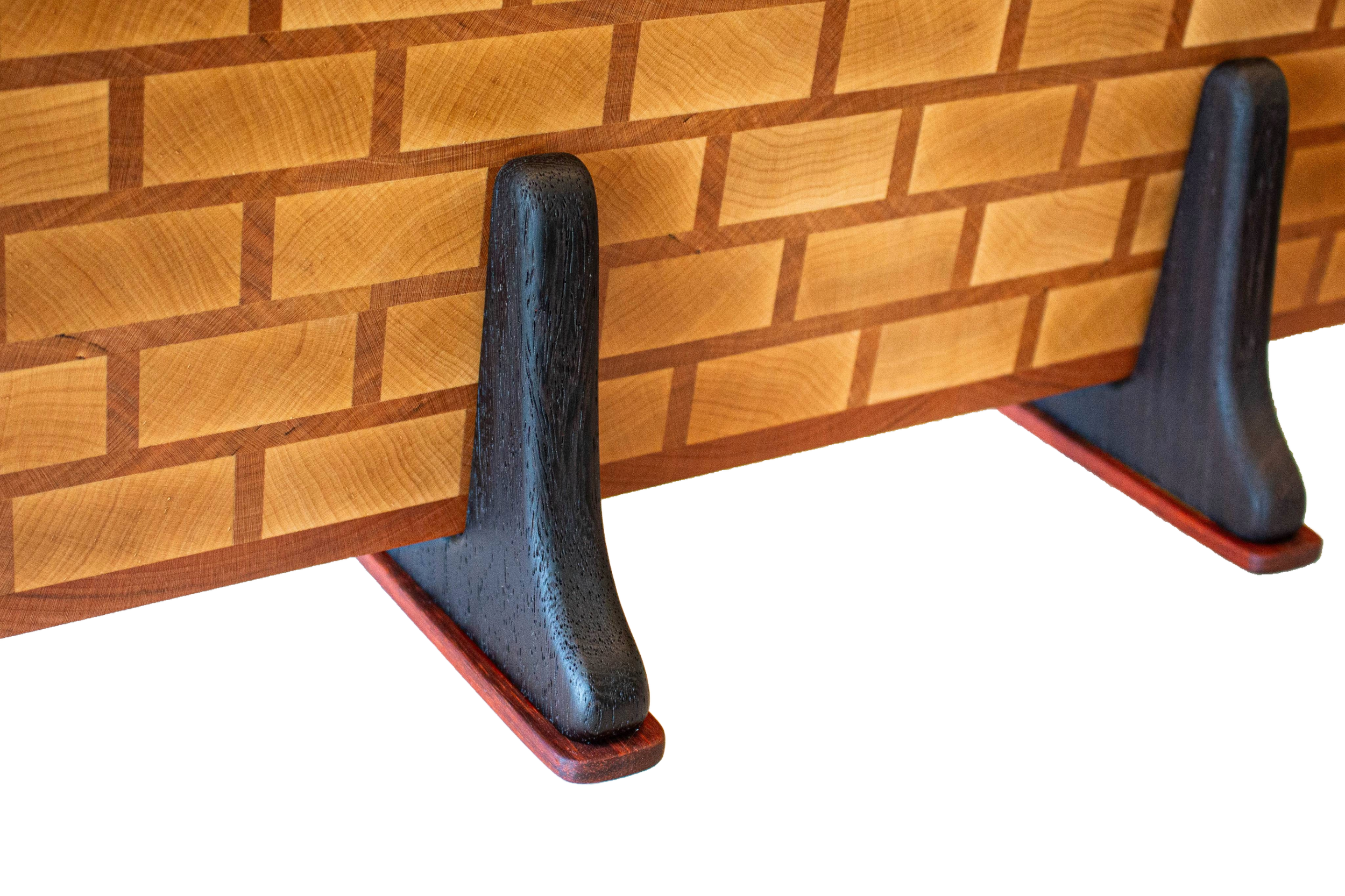 To complement the board, I also created two custom stands tailored specifically for it. These stands are crafted from wenge wood and African padauk, chosen for their striking contrast. The deep, dark tones of wenge against the vibrant, reddish hue of padauk add a sophisticated touch to the overall aesthetic, making this butcher block a stunning centerpiece in any kitchen.