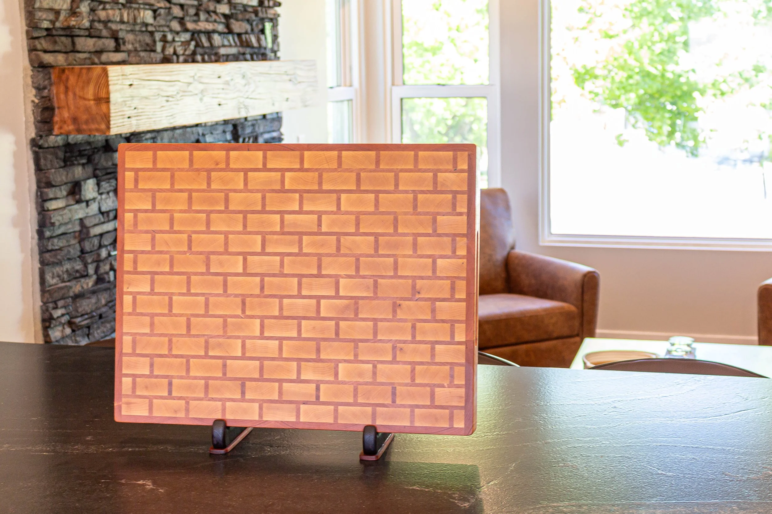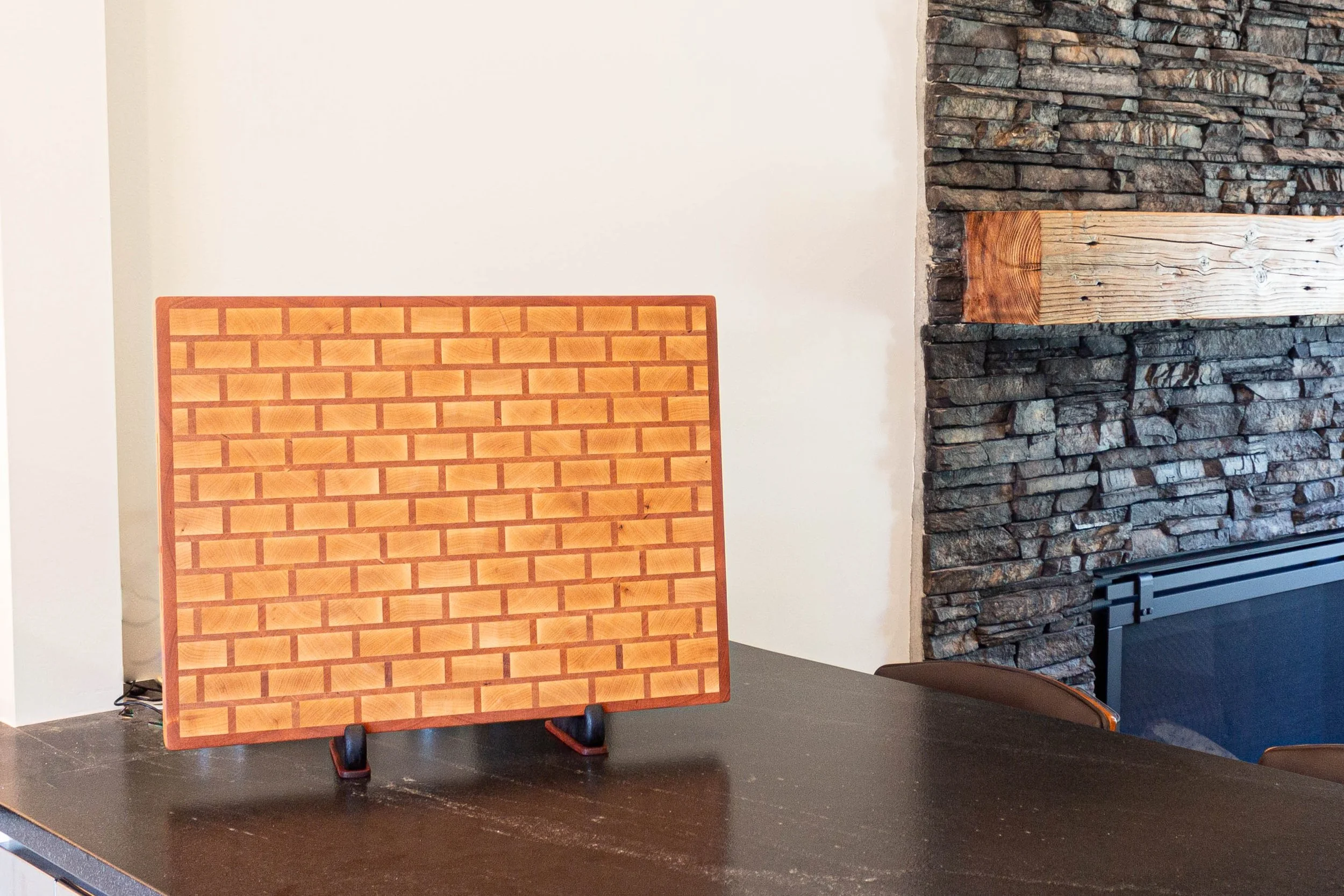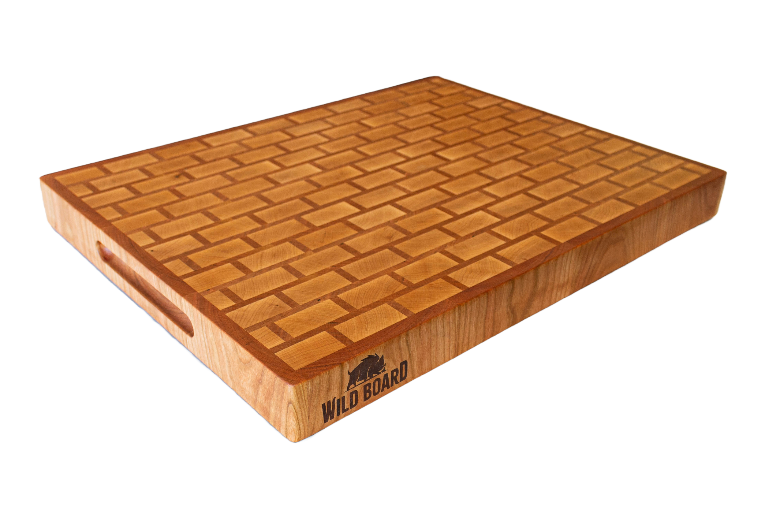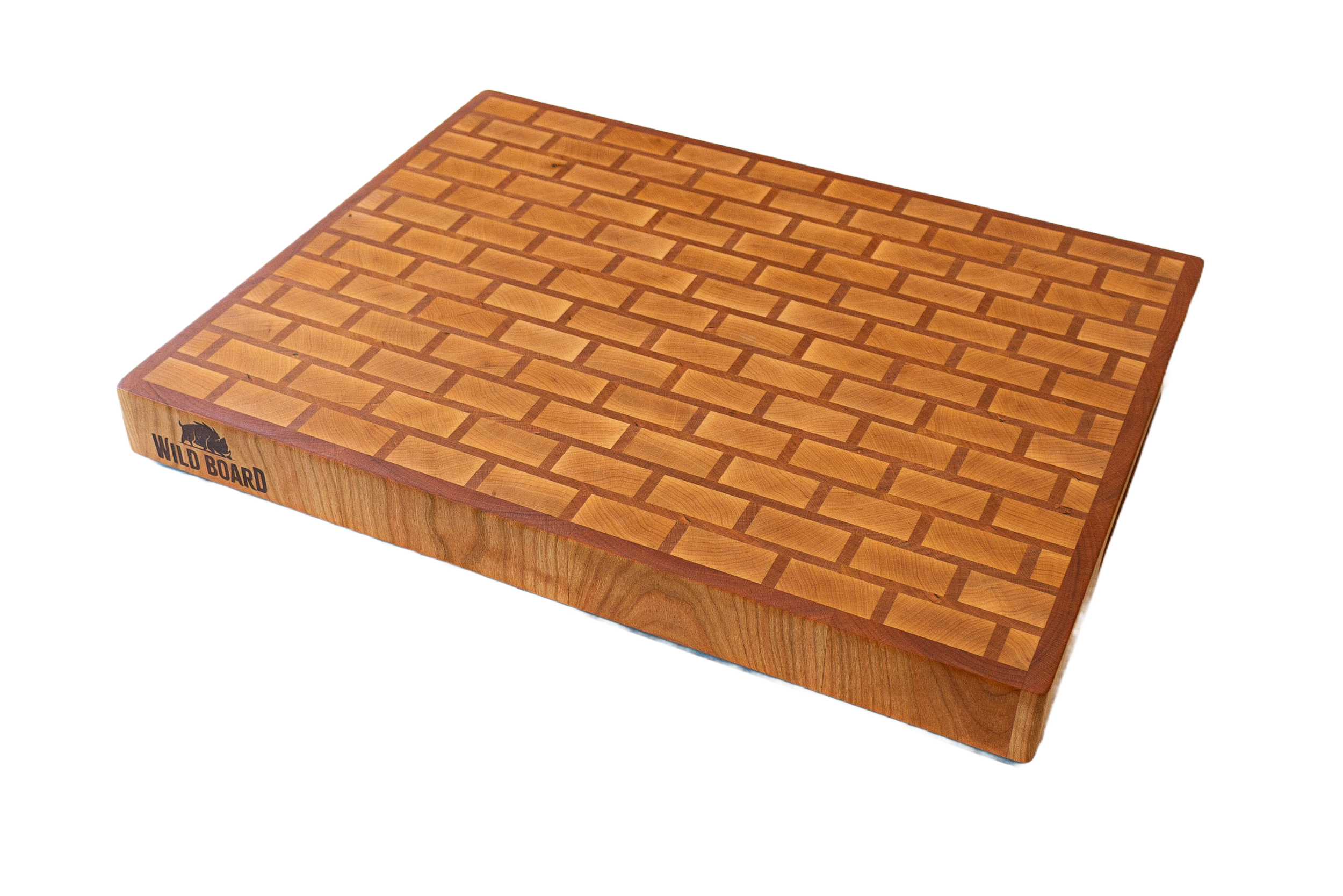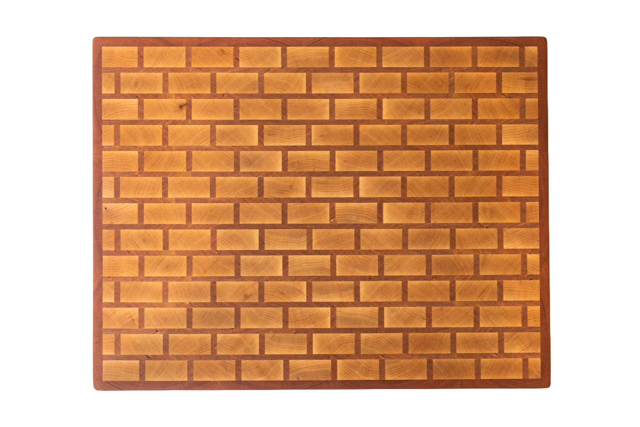 Recently, I had the pleasure of crafting a custom butcher block for a client in Northern California who wanted something large and robust for their kitchen. This board, measuring 22x17x2 inches, is not just a functional piece but a work of art. The end-grain construction, made up of rich cherry and maple, showcases a unique brick and mortar pattern, where the brick is maple, and the mortar and border are cherry.