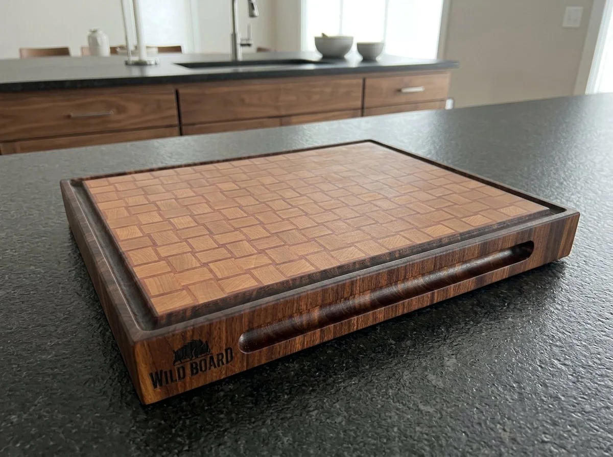 The surface features a basket weave pattern built from maple and cherry. Each section is a slice of maple set between two strips of cherry, rotated 90 degrees every other row, running consistently across the full cutting surface. A solid 1 inch walnut border frames the entire board, and the Wild Board logo is laser engraved directly into the walnut on the side.